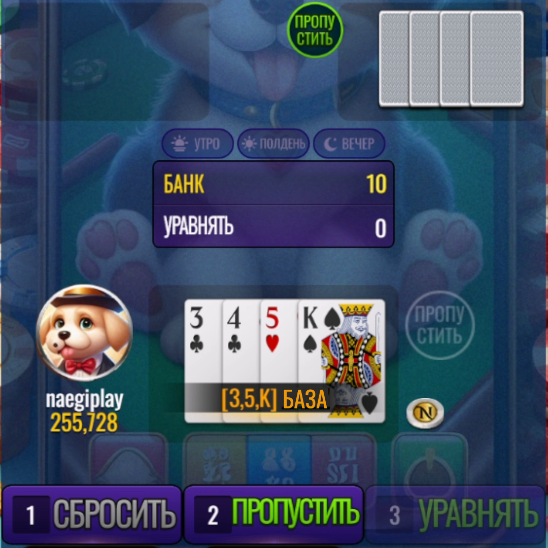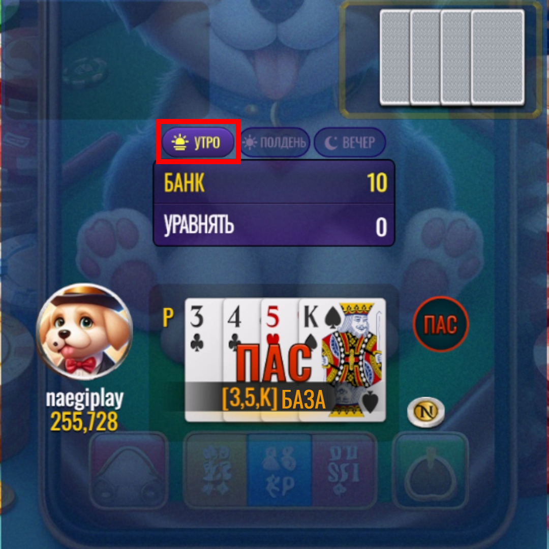 УТРО (первый раунд рисования) : · Игроки могут сбросить любое количество карт и получить новые от дилера, чтобы улучшить свою руку. · Если игрок доволен своей рукой, он может остановиться и ПАС (не брать карты).