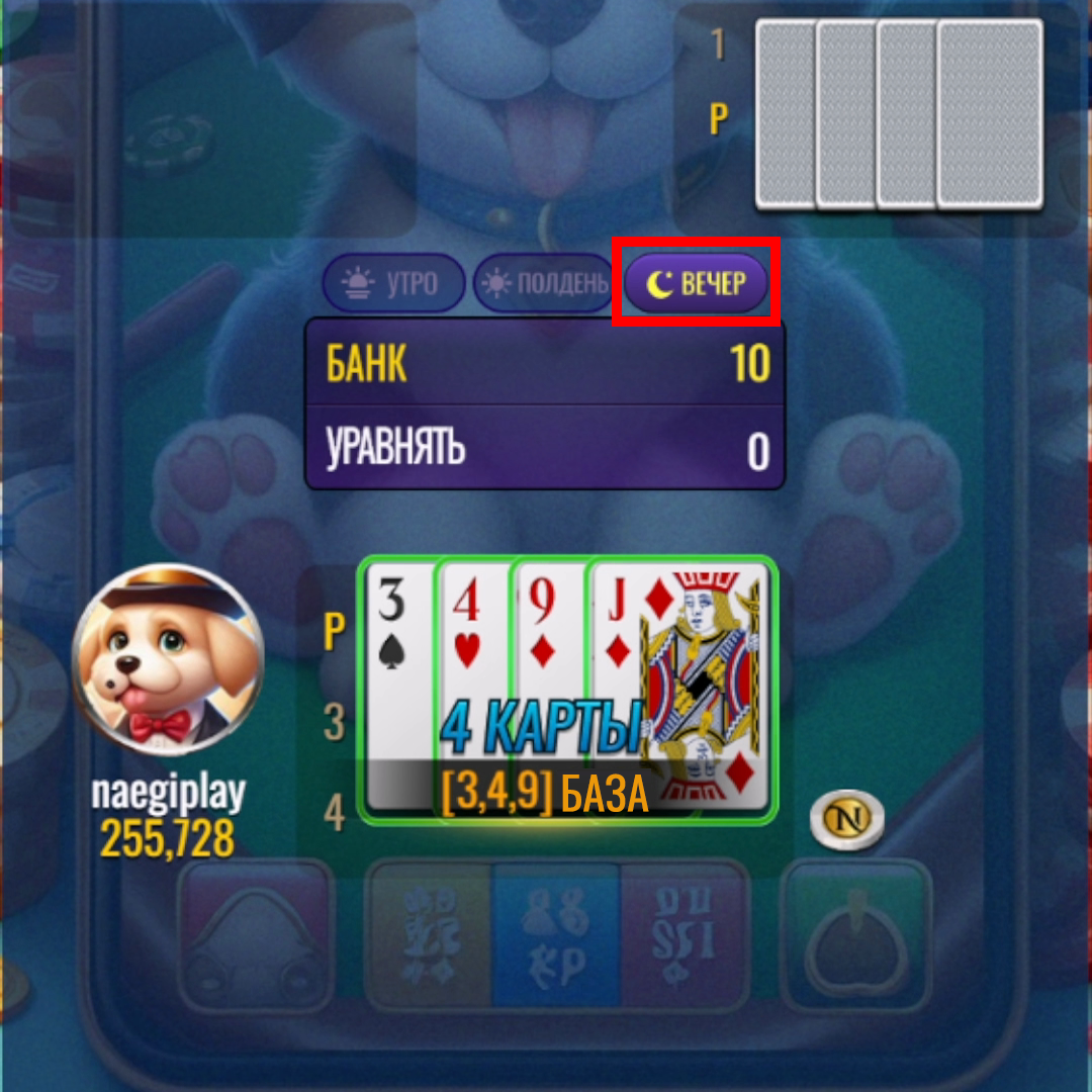 ВЕЧЕР (Третий раунд розыгрыша) : · Последняя возможность для игроков сбросить и взять карты.