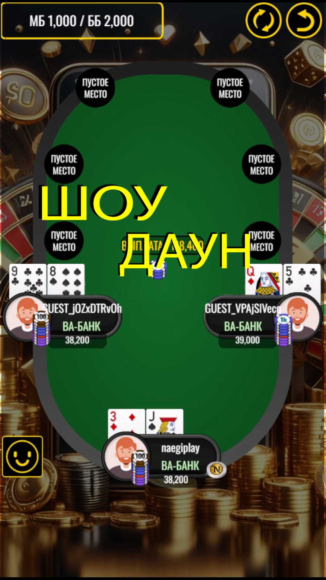 · ШОУДАУН : Пользователи, участвующие в ставках, раскрывают всем свои карты на руках. Побеждает пользователь, который заполнит карту с наивысшей комбинацией. (Если все пользователи пойдут олл-ин на этапах Пре-флоп, флоп или Ривер, игра немедленно переходит на стадию шоудаун.)
