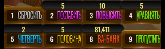 · СКИНУТЬ(1) : Откажись от раунда · ПОСТАВИТЬ(2) : Игроки могут делать ставки, если в текущем раунде ни один другой игрок не делал ставок. После того, как ставка сделана, другие игроки должны «УРАВНЯТЬ», уравняв сумму ставки, чтобы остаться в раздаче. · ПОВЫСИТЬ(3) : Возьмите сумму игрока впереди и удвойте ставку. · УРАВНЯТЬ(4) : Ставьте то же количество фишек, что и игрок перед вами. · ЧЕТВЕРТЬ(5) : Сделайте ставку в размере 25% от общего банка. · ПОЛОВИНА(6) : Сделайте ставку в размере 50% от общего банка. · МАКС(7) : Ставьте все фишки · ВА-БАНК(8) : Ставьте все фишки · ПРОПУСТИТЬ(9) : Нет ставок