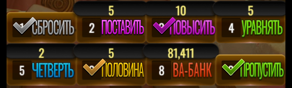 · СТАВКА ВСЛЕПУЮ : Все игроки ставят одинаковую ставку вслепую, исходя из ставки.