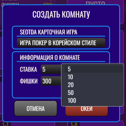 Существует 5 типов стейк-румов. ※ Минимальное количество фишек кратно СТАВКА каждого рума x60.