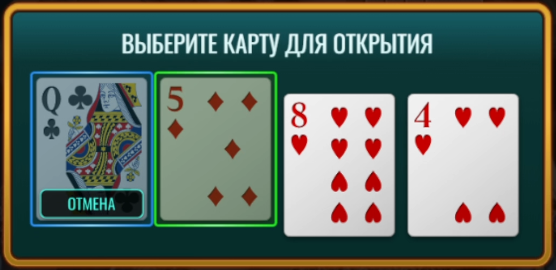 · СТАВКА ВСЛЕПУЮ : Все игроки ставят одинаковую ставку вслепую, исходя из ставки. · РАЗДАЧА : Каждому игроку изначально раздается четыре карты, и он выбирает одну карту, которую не использует. · А затем выберите одну карту и откройте ее.