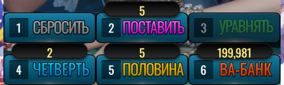 · СБРОСИТЬ(1) : Откажись от раунда · ПОСТАВИТЬ(2) : Игроки могут делать ставки, если в текущем раунде ни один другой игрок не делал ставок. После того, как ставка сделана, другие игроки должны «УРАВНЯТЬ», уравняв сумму ставки, чтобы остаться в раздаче. · ПОВЫСИТЬ(2) : Возьмите сумму игрока впереди и удвойте ставку. · УРАВНЯТЬ(3) : Ставьте то же количество фишек, что и игрок перед вами. · ЧЕТВЕРТЬ(4) : Сделайте ставку в размере 25% от общего банка. · ПОЛОВИНА(5) : Сделайте ставку в размере 50% от общего банка. · ВА-БАНК(6) : Ставьте все фишки