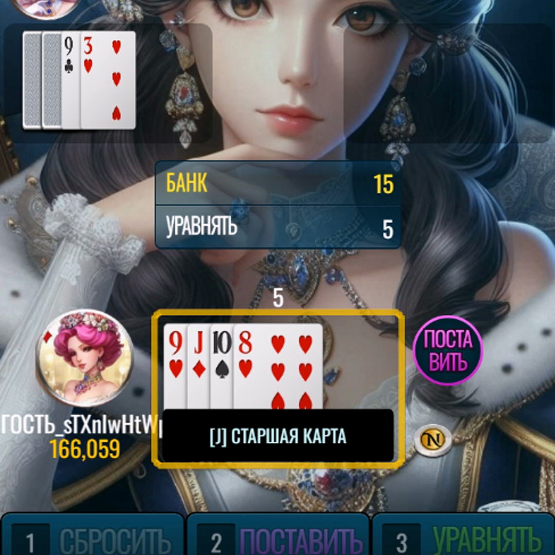 фина́л раунд ставок · Игроки получают последнюю карту. Игроки могут открыть ее самостоятельно, нажав на карту. · Игроки делают ставки на основе комбинации из пяти лучших карт в своих руках.
