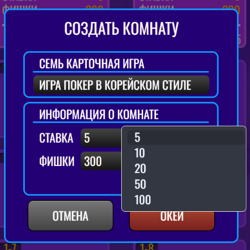 Существует 5 типов стейк-румов. ※ Минимальное количество фишек кратно СТАВКА каждого рума x60.