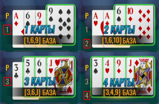 ПРИМЕР : В приведенном ниже случае ♣ 4, 8 и ♦ 4,J имеют две одинаковые масти, поэтому получается «ДВА БАЗА». Кроме того, когда две карты имеют одинаковый номер, это называется «ДВА БАЗА». 4♣ 8♣ 4♦ J♦ (4-8♣ / 4-J♦ ДВА БАЗА)