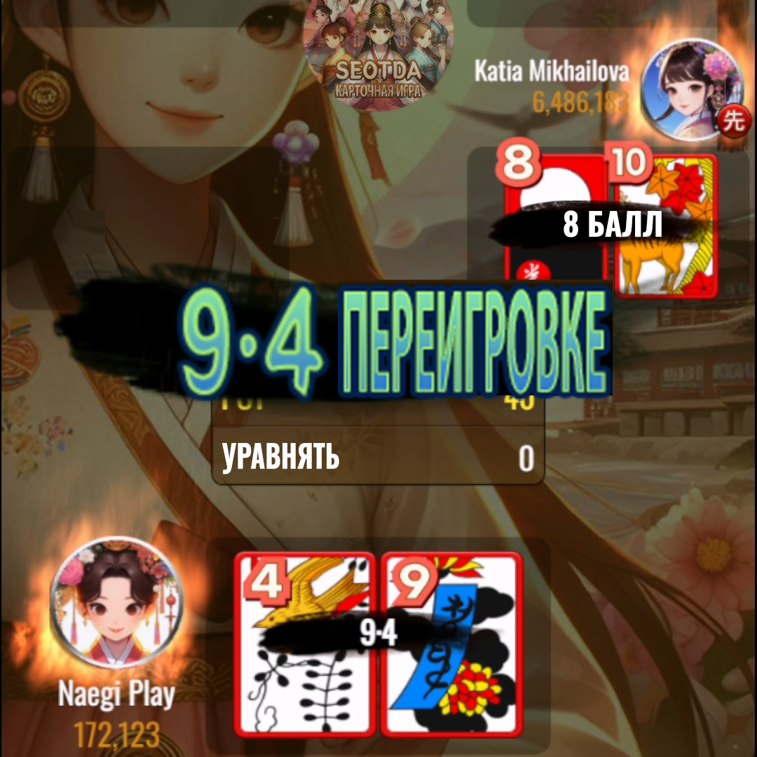“9·4” Как комбинация 4 и 9, если комбинация игрока составляет 1·2 или меньше, то есть, наивысшая комбинация соперника игрока составляет 1·2 или меньше, игрок может аннулировать этот раунд и провести повторный матч.