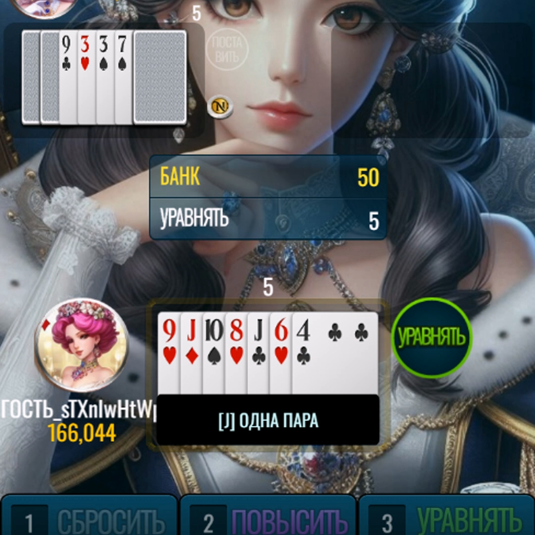 фина́л раунд ставок · Игроки получают последнюю карту. Игроки могут открыть ее самостоятельно, нажав на карту. · Игроки делают ставки на основе комбинации из пяти лучших карт в своих руках.
