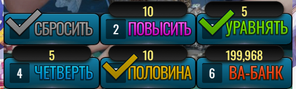 · СБРОСИТЬ(1) : Откажись от раунда · ПОСТАВИТЬ(2) : Игроки могут делать ставки, если в текущем раунде ни один другой игрок не делал ставок. После того, как ставка сделана, другие игроки должны «УРАВНЯТЬ», уравняв сумму ставки, чтобы остаться в раздаче. · ПОВЫСИТЬ(2) : Возьмите сумму игрока впереди и удвойте ставку. · УРАВНЯТЬ(3) : Ставьте то же количество фишек, что и игрок перед вами. · ЧЕТВЕРТЬ(4) : Сделайте ставку в размере 25% от общего банка. · ПОЛОВИНА(5) : Сделайте ставку в размере 50% от общего банка. · ВА-БАНК(6) : Ставьте все фишки