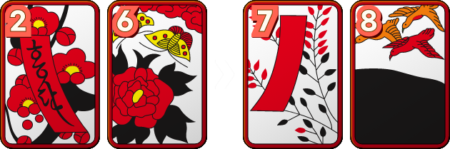 Example: Point (KKeut) When the number of digits of the sum of two numbers is from 8 to 1, it is said that 8 Point > 1 Point, and the higher the number, the better the hand. 2+6 = 8 > 7+8 = 5 ETC : 8 Point (Pal KKeut): Sum of cards equals 8 7 Point (Chil KKeut): Sum of cards equals 7 6 Point (Lyuk KKeut): Sum of cards equals 6 5 Point (O KKeut): Sum of cards equals 5 4 Point (Sa KKeut): Sum of cards equals 4 3 Point (Sam KKeut): Sum of cards equals 3 2 Point (i KKeut): Sum of cards equals 2 1 Point (il KKeut): Sum of cards equals 1